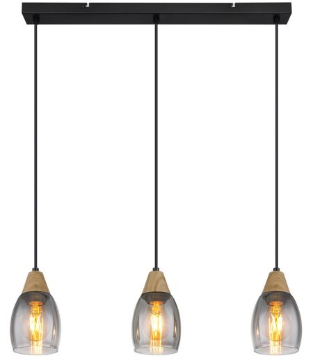 Black matt metal pendant, smoke -colored glass, dark wood -effect metal, black PVC cable, height can be shortened, LxWxH: 550x100x1200mm, excludes 3x E27 15W 230V Globo Lighting ...