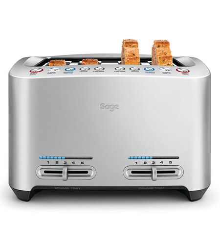 Sage The Smart Toast 4 Slice motorised diecast toaster. With most toasters, you can't see what's going on but, at the press of a button, the 'A Quick Look' feature allows toast to glide up and down to show you how the toast is browning - without interrupting the toasting cycle. If your toast comes up too light, there's the 'A Bit More' setting for a little extra toast time. Crumpet/Fruit Loaf and defrost settings are also on hand for ease and convenience. Independent 2 or 4 slice capacity. Self centering for even toasting, extra wide and deep for larger bread. High lift lever for safer and easier removal of toast, crumpets and muffins. A Quick Look - Fully motorised, one touch 'A Quick Look' button to check progress without interrupting the toast cycle. A Bit More Button - If your toast comes up too light, press 'A Bit More' for a little extra toast time. Browning control slider with LED progress indicator. Function Settings: 'A Quick Look', 'A Bit More', crumpet/fruit loaf, frozen and cancel. Progress Indicator: The countdown display shows you how long before your toast is ready. Ready Indicator audible sound alert when toasting has finished. Removable Crumb Tray for easy cleaning. Individual controls allow each pair of slots to work independently so you can simultaneously toast to different preferences. Sage 2 Year Repair or Replacement Guarantee. ...