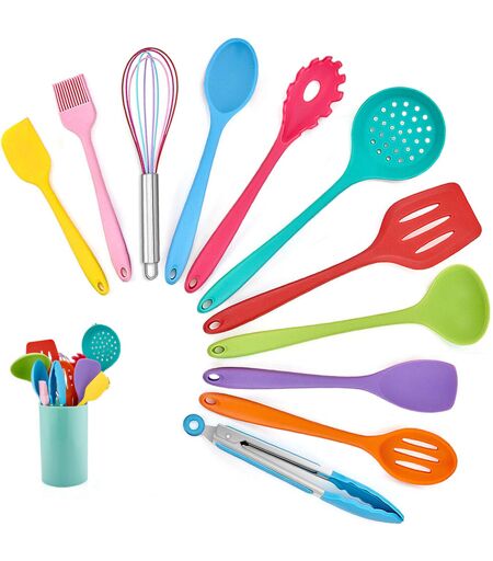 Ebern Designs Kitchen Utensil Set, 12 Piece Cooking Utensils, Silicone Kitchen Utensils Set With Holder, Heat Resistant Kitchen Tools Include Spoons Turner Spatula Red/Blue/Yellow