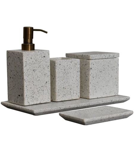 This 5-piece bathroom set is made of square polished white marble. Consists of a square soap dish, a toothbrush cup, a soap dispenser with a metallic dispenser head and a cosmetic box with a lid. A beautiful set of accessories for your bath as well as making a unique gift choice. Expect differences in texture, colour, grains etc., as this product is extracted from a natural source. This is a natural configuration and should not be considered a defect. Ivy Bronx ...