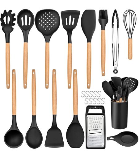 Belfry Kitchen Kitchen Utensils Set, 25 Pieces Soft Silicone Cooking Utensil Set With Holder, Natural Wooden Handle Kitchen Spatula Spoon For Cooking Baking, Non St Black