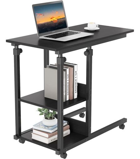 C-shaped side table, sofa couch bed end table, height adjustable mobile rolling laptop table with 2 tiers storage shelves, coffee snack table for small space, living room, bedroom. Williston Forge Table Base Colour: Black, Table Top Colour: Black ...