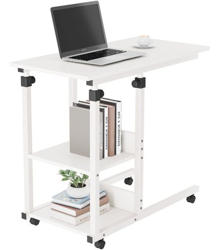 C-shaped side table, sofa couch bed end table, height adjustable mobile rolling laptop table with 2 tiers storage shelves, coffee snack table for small space, living room, bedroom. Williston Forge Table Base Colour: White, Table Top Colour: White ...
