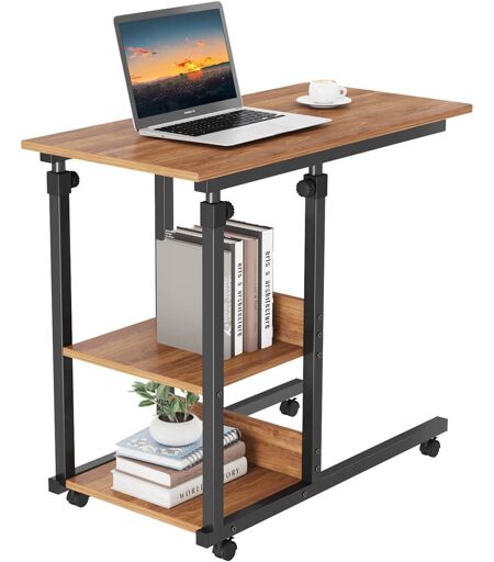 C-shaped side table, sofa couch bed end table, height adjustable mobile rolling laptop table with 2 tiers storage shelves, coffee snack table for small space, living room, bedroom. Williston Forge Table Base Colour: Black, Table Top Colour: Walnut ...
