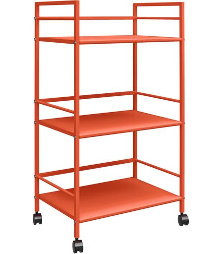 Use the Cart anywhere you need to add storage space. The blue finish on the powdercoated metal adds a fun pop of color and can easily be cleaned by wiping with a damp cloth. Three large shelves with wraparound bars on 3 sides allows you to organize glasses toiletry items craft supplies and or make the Cart into a fun coffee bar. The rolling casters make it easy to move the Cart where ever you need and 2 casters lock to keep the Cart in place. The Cart ships flat to your door and 2 adults are recommended to assemble. Each shelf can hold up to 20 lbs. 17 Stories Finish: Orange ...