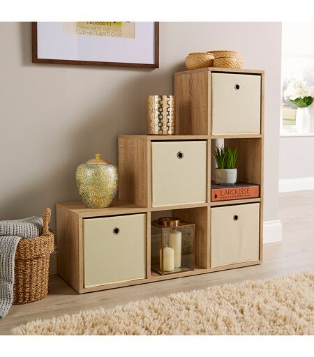 This bookcase has a clever design that is perfect for under the stairs. It has an eye-catching design that appeals to our sense of both order and progression. The first column has 1 cube, the next has 2 and the final one has 3. It is a great way to use the space under the stairs or to have it as a room divider especially as it has an open back. So you can spin it around so that it slopes to the left or the right plus you can access items from both sides, or admire them if you are using it to display ornaments and figurines, etc. Featuring strong, durable 15mm board - this sturdy unit is designed to last! For your bathroom and bedroom, lounge or dining room, kitchen or hallway, conservatory or home office, just put items directly on the shelves. Or if you choose to have it with the slot-in canvas storage cube boxes, you can fill them with anything from paperwork and office supplies, to beauty and hair care items, accessories clothes and shoes, towels and bedding, etc. Plus, the shape is great for placing items on the top too. Ebern Designs Colour: Oak ...