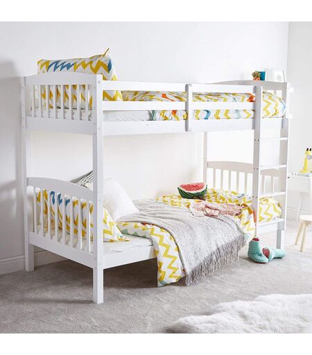 This bunk bed is a sturdy solid bunk bed suitable for children and adults. The bed is designed with safety in mind with four safety rails on the top tire and a strong ladder that is adjustable on either side. This bunk bed can also be split into two separate beds allowing you to arrange the children's bedroom as you please. The bed has a beautiful white finish which helps to retain the fine qualities of the timber. This bunk bed features solid wooden slatted bases for additional comfort and support. The bed comes flat-packed for ease of delivery and storage. Two people are required for the assembly. The item will be heavy once assembled. Mack + Milo ...
