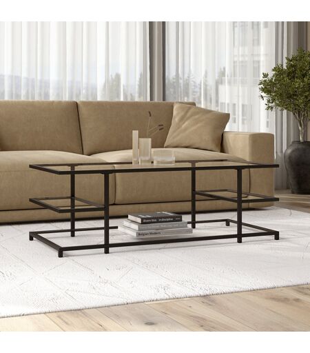 A bold linear profile sets this modern contemporary coffee table apart. Its inset frame echoes the cantilevered design of mid-century architecture, while the durable tempered glass shelves create an artful backdrop for framed photos, flowers, or your favorite collections of decorative items. The eye-catching look can blend in or stand out in your living room, family room, or den. Canora Grey Colour: Clear/Blackened Bronze ...