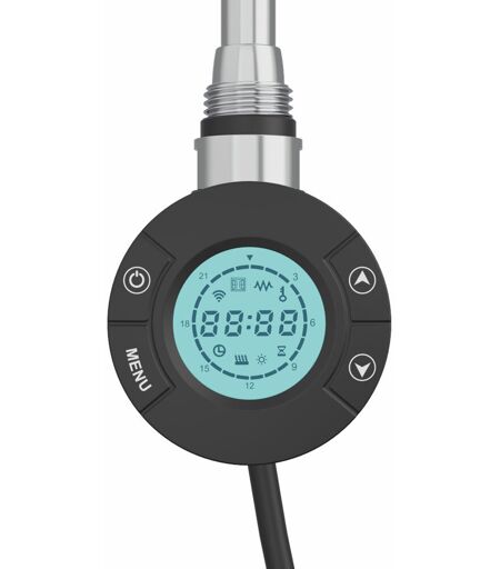 Specification-Thermostatic Electric Heating Element for Towel Radiators.-Input Voltage: AC230V/50HZ.-LCD Display for clear information and ease of Temperature setting.-Come with WIFI Function, can be controlled via a smart device like smartphone or tablet (Need to download APP - "Smart life").-Operative modes: Manual user mode/ Scheduling mode/ Constant temperature mode/ Timing mode.-Connection Thread size: 1/2" BSP.-Operating Temperature Range: 0-55℃.-Temperature Setting Range:30-70℃.-Time mode: 24-hours.-Week mode: Digital display 1~7 days.-Power cable length: 1.1-1.2m approx.-Comes with T piece and blanking plug.Element Tube Length:150w,200w Heating Element - 245mm;250w,300w Heating Element - 315mm;400w Heating Element - 395mm;500w Heating Element - 465mm;600w Heating Element - 545mm;700w 800w Heating Element - 685mm;1000w Heating Element - 755mm. Belfry Bathroom Finish: Black ...