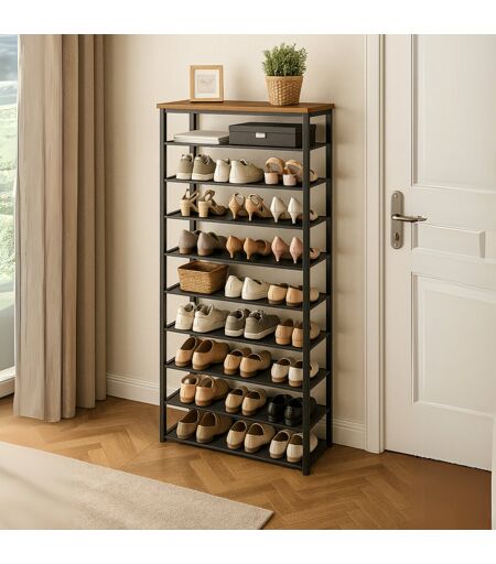 Impress Your Friends: This shoe rack seamlessly combines functionality with aesthetics, making it a striking addition to your living space. Crafted from elegant rustic brown particleboard and accentuated by a sleek black metal frame, it serves as a tasteful piece of furniture that reflects your impeccable style. Generously Sized Shoe Storage: Measuring 75 x 28.5 x 159 cm, this 10-tier shoe storage organizer is a true space-saving champion, offering ample room to accommodate up to 36 pairs of shoes. It effectively transforms cluttered entryways into well-organized spaces, leaving a refreshing impression. Sturdy, All-Metal Construction: The shoe rack's large-capacity design features high-quality particleboard and robust metal mesh shelves, ensuring enduring durability and resilience, even when bearing heavy items. The top plate is capable of supporting up to 10 kg, while each mesh shelf can handle up to 5 kg without showing signs of aging or bending—meeting your expectations and more. Versatility for All Footwear: This capacious shoe rack comes equipped with removable shelves, making it suitable for storing a variety of footwear, from sneakers and slippers to boots and heels. Customizing the configuration to accommodate different shoe types is effortless. Say goodbye to the days of disorganized shoes. Effortless Assembly: Setting up the shoe rack is a breeze, with clear, step-by-step instructions and well-numbered parts ensuring a quick assembly process. For added safety, the provided anti-tip accessory offers peace of mind, especially if you have active kids in the house. Borough Wharf ...