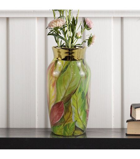Rosdorf Park Sandersen Handmade Ceramic Vase for Living Room Decoration, Green & Pink Leaves Modern Home Decor Accent Piece Green;Pink 31cm H X 14.8cm W X 14.8cm D