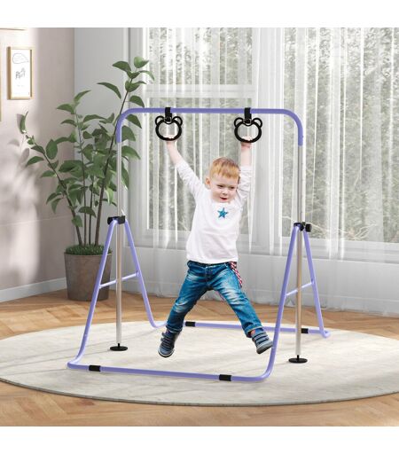Unleash your child's inner gymnast with the HOMCOM Kids Gymnastics Bar! With its stable triangular structure and non-slip mats, safety is top-notch. Plus, the height adjusts five levels, growing with your little athlete. When playtime's over, simply fold and tuck it away. Great for young gymnasts aged 3+ to refine their skills at home!- Stable triangular structure reduces risk of tipping during use; - Four non-slip mats and two-round bases prevent movement and enhance safety; - Adjustable five height levels accommodate growing children; - Two gymnastics rings provides more different play ways; - Foldable design for easy storage in small spaces; - Steel construction ensures durability and longevity; - Smooth spray finish for a safer, sleeker touch; - Assembly required; - Material: Steel; - Overall Dimensions: 148L x 105W x 88-128Hcm; - Folded Size: 105L x 39W x 118Hcm; - Adjustable Height Spacing: 10cm; - Maximum load: 50kg; - Recommended/Qualified Age: 3+ years; - Qualification: EN71-1-2-3; - Item Label: 340-016V00BU; Isabelle & Max Colour: Purple ...