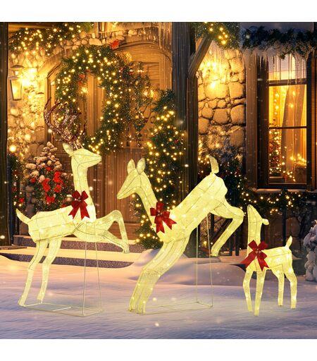 An enchanting scene for your christmas outdoors, with this HOMCOM reindeer display. Formed of a Buck, a Doe and a Fawn, all together and complementing each other. Made from metal, the frames are solid: they keep in shape to be used time and again. covered in 300 LED lights, this decoration lights the area beautifully - great for night times! With an IP44 rating, it is water-resistant - suitable for covered outdoor use.- Light-up Christmas reindeer family: a pretty piece for your Christmas display; - 300 warm white LED lights for gentle and inviting illumination; - Metal frame means a tough structure which stays in shape; - IP44 rating is safe against light water splashes. Suitable for covered outdoor use; - Easy to assemble. No tools required;- Colours: White, Red, Brown; - Light Colour: Warm White; - Type: LED Light Up Reindeer Family Wearing Red Bow Ties; - Materials: PP, Steel; - Overall Dimensions: 103L x 27W x 152Hcm (Buck), 97L x 23W x 105Hcm (Doe), 43L x 18W x 76Hcm (Fawn); - Power Cord Line Length: 5 m; - LED Light Power: 0.03 W; - Input Voltage: 220-240 V, 50/60 Hz; - Output Voltage: 4.5 V/3.6 W; - Item Label: 844-996V70WT; Note:; Please do not plug it into the socket before installation; Please do not use on rainy days; The Seasonal Aisle ...