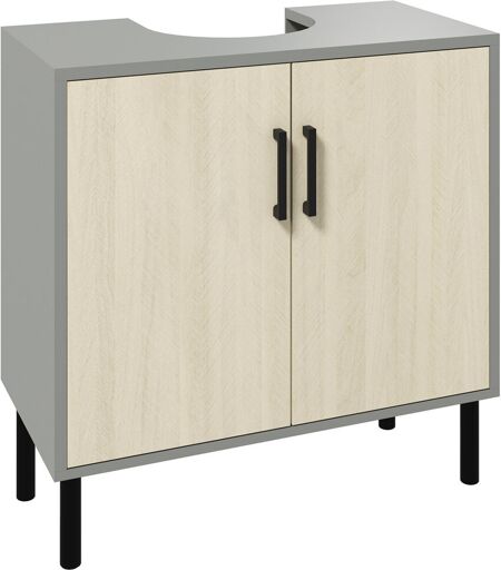 Bring Farmhouse style into your bathroom, whilst saving space: look to this HOMCOM under sink bathroom cabinet. It comes with a 'U' shaped cut-out hole, which slots into the sink pipe. It features inner storage - a middle shelf which thus creates two handy areas for toiletries, towels, cleaning products are more. The four legs elevate the sink cabinet and make it easy to clean underneath. Complete with metal handles to open and close the doors easily.- Inner storage: plenty of room for bathroom essentials; - Under basin cabinet, with 'U' shape cut out, fits into base of sink' - Anti-tipping straps included for safety; - Sturdy particle board, with a light melamine coating; - Maximum load 15kg, assembly required;- Colour: Grey, Yellow Oak; - Material: Particle Board, Metal; - Overall Dimension: 60W x 30D x 60Hcm; - "U" Cut-Out Dimensions: 20W x 22Dcm; - Suitable for Wash Basin Width: Within 60cm; - Each Shelf inside Cabinet: 57.5W x 28D x 22Hcm; - Weight Capacity: 15kg (total), 3kg (shelf); - Item Label: 834-583V00GY; 17 Stories ...