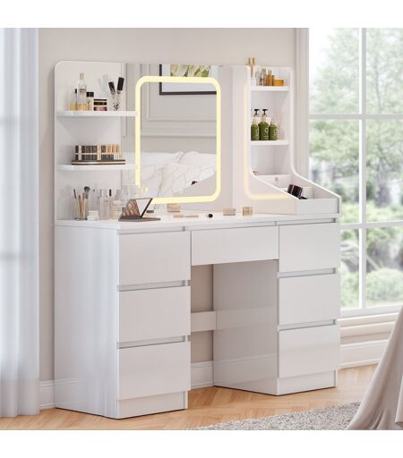 17 Stories Rosse Dressing Table With 3 Colorful Light Mirror 7 Drawers and 7 Storage Shelves Makeup Desk 110cm Desktop Vanity Table White 139cm H X 110cm W X 40cm D