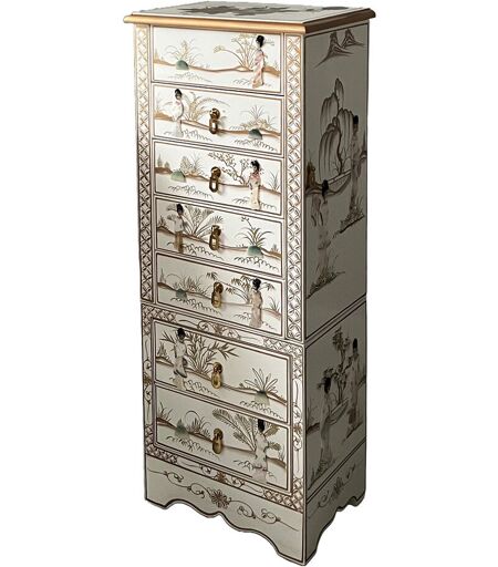 Beautifully presented Freestanding Jewellery Armoire with Gold Hand Painted Accents and set with carved Mother Of Pearl Sculptures. This stunning piece has an array of drawers which are lined and incorporates a ring tray and segmented compartments. The top opens to reveal the inset mirror and further storage. Open the 2 side doors where there is space for hanging necklaces, scarves etc. A beautiful accent piece which can house an ample amount of jewellery or accessories Rosalind Wheeler ...