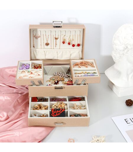 ❤【Jewelry Box】: Open the upper cover of the jewelry box, there are 10 necklace hooks, and two small jewelry trays with grids, earring holes and ring grooves that can be moved left and right. There is a large space under the jewelry tray to place any jewelry. At the very bottom of the jewelry box is a drawer with compartments. Open the top cover of the jewelry box, there are 10 necklace hooks, two small jewelry trays with grids, earring holes and ring slots, and a drawer with compartments at the bottom. Brayden Studio Finish: Beige ...