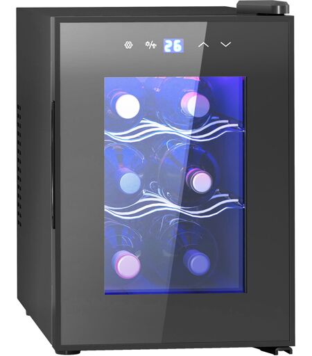 Chill your cherished bottles to perfection in this wine fridge. Two full-length chrome racks hold six bottles; also adjustable to fit larger bottles when needed. Adjust the temperature between 8-18℃ to find the coolness best for you. Complete with a triple glass door, which is also resistant to damaging UV rays.- 8-18℃ adjustable temperature: cool inside how you want. Operated via touch control; - 35dB quiet operation, 'E' energy rating; - Two racks, holds six bottles; - Triple glass door with UV protection for safety; - Blue top light to see inside easily; - Compact design is suitable for desktops or under counters; - Adjustable feet pads to keep balance;- Colour: Black; - Material: Metal, Temperate Glass; - Overall Dimension: 26.5W x 51.5D x 39.3Hcm, 17L; - Rack Height: 8.6-9.4cm; - Door Size: 26.5W x 4D x 35.5Hcm; - Suitable Bottle Size: Φ7 x 31.5Hcm; - Noise Level: 35dB; - Temperature Range: 8-18℃/46-64℉; - Door Opening Angle: 180°; - Cable Length: 1.7m; - Weight Capacity: 15kg; - Input: 230V/50Hz; - Output: 65W; - Item Label: 800-245V70BK; Metro Lane ...