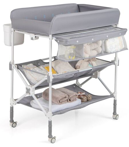 This nursery organizer is designed with ample storage including a 3-compartment basket, 2 shelves, and a trash bin for easy access to baby essentials. The stable metal frame, support board, and protective plates guarantee safety, while the easy-folding feature allows for space-saving storage or travel. Parents will enjoy hassle-free maintenance with a waterproof surface and machine washable cover. With 4 lockable wheels, the movement between rooms is a breeze. Zoomie Kids Colour: Grey ...