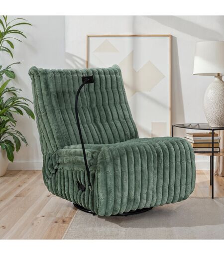 Designed with jumbo cord fabric and a relaxed silhouette, this chair brings bean bag-inspired comfort into a structured form. It features a manual side lever for reclining, a swivel-rocking base, and a built-in phone holder. Photographed under bright studio lights, the item and its colour may appear slightly different in various environments due to lighting and screen settings. Please note that the actual dimensions of the chair may vary slightly from those listed on the site. Fairmont Park Upholstery Colour: Green ...
