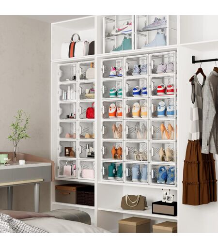 Overall Assembled Size: 13.1(L) x 9.8(W) x 7.5(H) inches/33.2(L) x 25(W) x 18.7(H)cm, suitable forUK 12. Facing the messy shoe storage space, this stackable plastic shoe box can be the best choice.More Space + Aromatherapy Stick + Magnet Door + Ventilation Holes. The shoe box fits sizes up to UK 12. Aromatherapy Stick and Large ventilation hole ensure air circulation and odor prevention. The door magnet can make the door close tighter, not easy to fall. Heels, flats, sneakers, flip flops, sandals, wedges and more, just put them in.The shoe box can be tightly connected up and down, you only need to lift the top one shoe box, then the whole row of shoe boxes can be removed together without falling. These stackable storage bins can be arranged to suit various spaces e.g. entryway, closet, under the bed, cabinet, drawers. Rebrilliant Finish: Clear ...