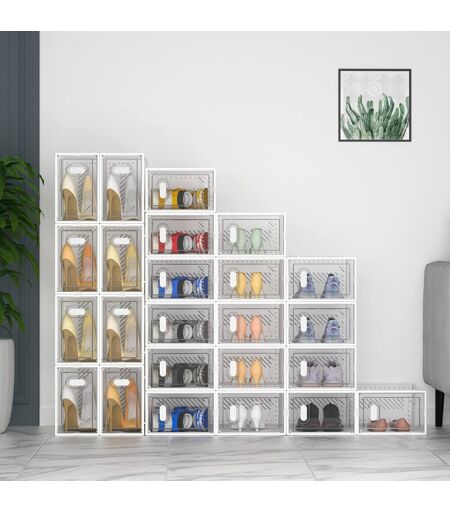 Overall Assembled Size: 13.1(L) x 9(W) x 5.7(H) inches/33.2(L) x 23(W) x 14.5(H)cm, suitable for UK 9.5. Facing the messy shoe storage space, this stackable plastic shoe box can be the best choice.More Space + Aromatherapy Stick + Magnet Door + Ventilation Holes. The shoe box fits sizes up UK 9.5 ,Aromatherapy Stick and Large ventilation hole ensure air circulation and odor prevention. The door magnet can make the door close tighter, not easy to fall. Heels, flats, sneakers, flip flops, sandals, wedges and more, just put them in.The shoe box can be tightly connected up and down, you only need to lift the top one shoe box, then the whole row of shoe boxes can be removed together without falling. These stackable storage bins can be arranged to suit various spaces e.g. entryway, closet, under the bed, cabinet, drawers. Rebrilliant ...
