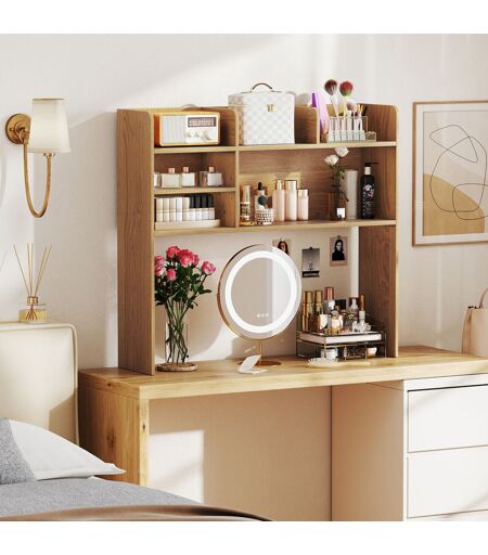 Ample Storage Space: The desktop bookshelf offers a streamlined solution to manage clutter with 3 upper shelves, 2 side compartments, and a big open compartment. It’s perfect for storing books, photos, clocks, and other essentials, maintaining a tidy and organized desktop. 17 Stories ...