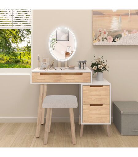 Metro Dressing Table with LED Lighted Mirror, Makeup Vanity Desk with Stool and 2 Drawers Cabinet, 70CM Desktop Vanity Table Beige 134cm H X 70cm W X 34.5cm D