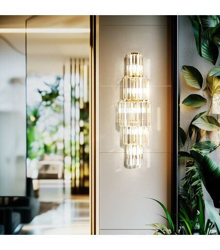 5-tier crystal wall sconce with elegant layered design. Space-saving bracket mounting. Intricately cut crystals refract light beautifully, creating dazzling sparkle. Three lighting modes (3000K-6000K). Gold-plated durable bracket. Hardwired installation. Enhances ambiance as decorative lighting. Ideal for mirrors or accent walls. Combines luxury and functionality. Fairmont Park ...