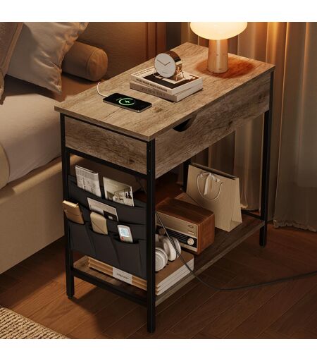 Featuring a storage shelf & one storage drawer, Side table provides a harmonious blend of private and accessible storage. which perfectly serves as coffee table, nightstand, or sofa table. Equipped with 2 standard AC outlets, 2 USB ports, and a 2m power cord, you can conveniently charge your phone, tablet, desk lamp, or laptop, ensuring all your devices are ready at all times. Crafted from thick MDF wood & metal frame, Nichill bedside table is strong and stable for long-lasting durability. The adjustable feets also prevent your wooden floor from scratches. Ivy Bronx Table Top Colour: Rustic Brown ...