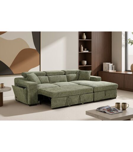 This corner sofabed combines modern function with a clean, streamlined shape. A pull-out base converts the sofa into a bed, while the chaise section lifts to reveal generous storage. Adjustable headrests offer personalised comfort, and the built-in side panel includes a cupholder and wireless phone charger — perfect for day-to-day lounging with added convenience. Photographed under bright studio lights, the item and its colour may appear slightly different in various environments due to lighting and screen settings. Please note that the actual dimensions of the item may vary slightly from those listed on the site. Latitude Run Orientation: Right Hand Facing, Body Fabric: Green Chenille ...
