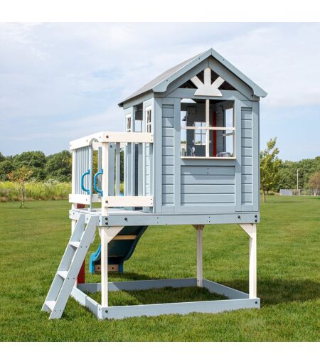 Elevate fun to a new level with Backyard Discovery's Beacon Heights Playhouse. Designed with a variety of engaging features to inspire creative play, this stylish outdoor playhouse is perfectly sized for smaller gardens without sacrificing fun. The raised design includes a wrap-around deck, fast wave slide, and flat-step entry ladder, ensuring easy access for children of various ages. Crafted from high-quality cedar wood and finished in a soft blue with crisp white trim, this wooden playhouse delivers a charming aesthetic to enhance any garden area. The bright and airy interior features large windows that welcome natural light, creating a welcoming space for play. Children will adore the functional half door, bell, and interactive play kitchen complete with toy hob, sink, battery-powered appliances, and engaging accessories. This children's playhouse turns everyday moments into thrilling adventures. Whether they're serving up imaginative treats in the pretend kitchen, zooming down the wave slide, or hosting magical tea parties on the sun porch, the Beacon Heights provides endless opportunities for active play and social development. The integrated growth chart allows you to monitor and celebrate your children's height milestones, while creating enduring memories. Built to endure, the Beacon Heights Playhouse creates a captivating hideaway where adventures commence. Backyard Discovery ...
