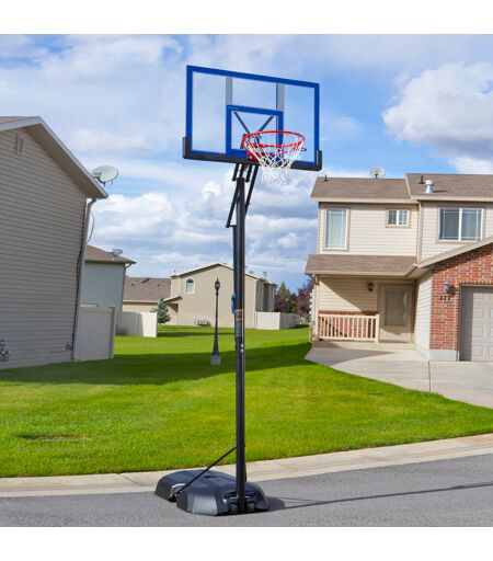 This portable basketball system features a 121 cm steel-framed shatterproof backboard with a speed shift height adjustment mechanism that adjusts from 243 cm to 304 cm high. It also includes a slam-it rim with an all-weather nylon net and a 7.6 cm diameter round steel pole. With a 128-liter portable base, this system can easily be moved to the desired location. So bring the arena to your home with a residential basketball system. Lifetime ...