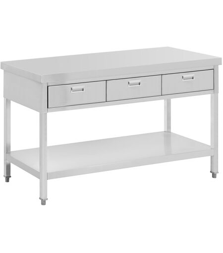 Want a large work desk with well-organised storage space nearby? Then choose the stainless steel table with drawers from Royal Catering! The stainless steel worktable not only impresses with excellent organisation of your utensils, but also with high hygiene standards that meet the requirements of your kitchen. The stainless steel work table with drawers offers you a work surface of 150 x 60 cm for preparing your food. Thanks to a load capacity of 150 kg, you can even carry out robust work on the stainless steel table. The resistant stainless steel surface is reinforced by an MDF panel. The stainless steel work table with drawers offers you plenty of storage space, with all utensils within easy reach. Directly under the worktop, you can store your ingredients and smaller kitchen utensils such as meat tenderisers, whisks or knives in the three smooth-running drawers, each measuring 44 x 40 x 11 cm. For larger items and storage containers, you will find plenty of space on the lower shelf with an area of 146 x 56 cm. This means you always have everything at hand for every step of your work! With stainless steel furniture, you not only enhance your kitchen furnishings, but also meet all the hygienic standards that are essential to a good kitchen. The material is food-safe, so you don't have to worry about preparing your dishes. The smooth surfaces are effortless to clean and always look nice and shiny. In the drawers, your kitchen utensils are safely protected from water, flour or dust. The stainless steel table with drawers will convince you in the long term with its high-quality and precise workmanship, which proves to be extremely stable and durable. Thanks to the supplied assembly material and detailed instruction manual, the stainless steel work table is quick and easy to assemble. ...
