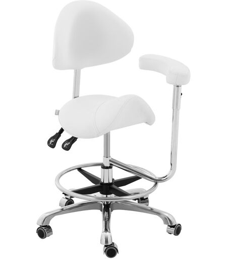 This comfortable saddle chair with back support and an armrest from physa has a seat shaped like a saddle, as the name suggests. Equipped with smooth-rolling swivel casters and multiple adjustment options, this chair fits right in in any beauty or hair salon, especially when the work calls for adjustable height and incline, comfort and stability. It also provides high mobility in narrow spaces, is made to high manufacturing standards and has a load capacity of up to 150 kg. This saddle chair is especially invaluable because it can be used in so many settings, including in tattoo parlours, spas, wellness studios, at home or in the office. Are you looking for maximum comfort that is easy on the back? Then this saddle chair is the perfect choice for you: the backrest can be tilted by 0 - 22° via a lever. The backrest can be adjusted in height from 90 - 100 cm thanks to another easy-to-use lever. The 5 cm-thick Foam seat cushion is covered with PVC leather and offers additional comfort, as does the upholstered armrest. The work stool has a cruciform base with 5 smooth-rolling, 360°-swivelling casters which make pushing or pulling the chair much easier, whether in commercial or private spaces. At the same time, the cruciform base provides stability. The whole saddle chair can also be rotated 360 degrees, which is especially useful when doing work that requires mobility. In addition, the seat of the saddle stool can be easily and quickly adjusted in height from 51 - 61 cm. To adjust the seat height, simply press the lever under the seat in the respective direction and the seat moves smoothly up or down thanks to the efficient Gas spring mechanism. The sturdy rolling stool with backrest supports a maximum weight of 150 kg. The PVC leather cover is very easy to clean overall as it repels liquids and dust. High-quality materials ensure robust construction. The mix of chrome-plated steel and the elegant cover also ensures a stylish and appealing look. ...