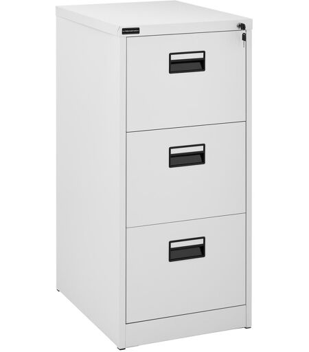 The compact metal filing cabinet STAR_MCAB_18 brings order to your office. Important documents are securely stored in the drawers and can also be systematically stored in hanging files if required. The hanging file cabinet is an unobtrusive grey, so it will blend in to any environment. The suspension filing cabinet's solid construction and the ability to securely lock the drawers offer security. The lock is made of a durable zinc alloy. This means that your documents can always be kept securely locked in the suspension filing cabinet. The metal filing cabinet has a total of three drawers which you can equip with hanging files. This ensures that important papers are not only perfectly organised but also always within easy reach. The filing cabinet is made of cold-rolled steel coated with nearly indestructible epoxy resin. This makes the metal office cabinet able to withstand harsher environments without showing any signs of wear. The drawer suspensions are reinforced and can be opened and closed effortlessly. Each drawer has an integrated label holder. The drawers, which have a material thickness of 0.6 mm, have a reliable total load capacity of 125 kg. The metal filing cabinet is easy to assemble and install with screws using the instruction manual. The 52.9 x 40.1 x 24.6 cm drawers offer plenty of storage space to enrich any office. ...