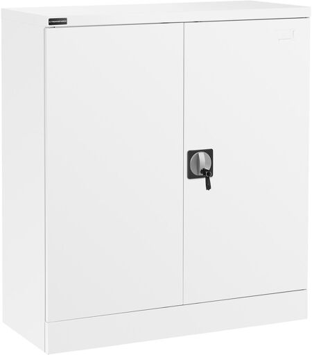 The locking metal cabinet STAR_MCAB_21 from Fromm & Starck, the experts for high-quality industrial equipment, brings order to your office or workshop. You can safety store important documents or indispensable materials inside. The office cabinet is an unobtrusive white, so it will blend into any environment. The steel office cabinet's solid construction and mechanical cylinder lock with two keys ensures security. This means that your important documents, work materials and valuables can always be kept safe from unauthorised persons. The sturdy office cabinet is made of resilient 0.6 mm-thick steel. This makes the storage cabinet also suitable for harsher environments such as an industrial warehouse or workshop without showing signs of wear. The cupboard with its two height-adjustable shelves has a maximum load capacity of 80 kg. The 102 cm tall and 91.5 cm wide steel cabinet is easy to assemble with the help of the instruction manual, offers plenty of storage space and is very low maintenance—an excellent addition to your office furniture or workshop. The feet are coated in plastic to protect the floor from scratches and other damage without forfeiting stability. ...