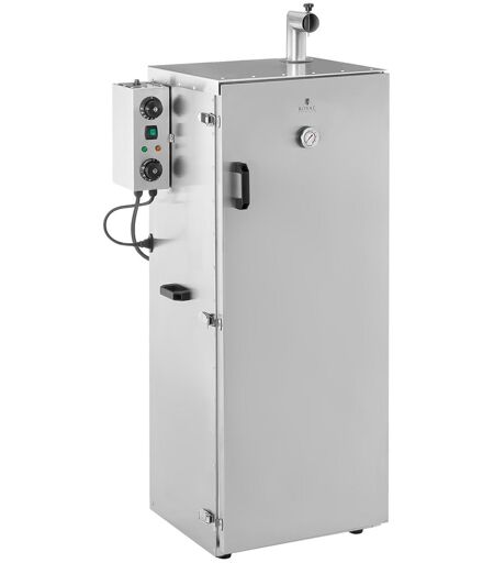 The elegant food smoker RC-FS1300 is designed for professional use in catering establishments, be it restaurants, inns, hotels or agriturismo businesses. The electric smoker box can be used for cold, warm and hot smoking of various products, including cheese, sausages, poultry and game as well as fish. In order to achieve perfect results, the device is designed for continuous operation and has a timer function. Due to a selectable time span of 0 - 120 minutes, you can prepare your smoked food to the minute. An alarm signal sounds as soon as the preset time has elapsed. If the desired degree of browning has not yet been achieved after the first run, the timer on the smoke box can be set again. Our recommendation: Let the fish dry well before smoking it. Only then does the fish achieve its typical golden-brown smoky colour. During the entire smoking process, a thermometer on the side of the casing shows you the temperature inside the smoking barrel. This means that you always have an eye on the cooking process and can readjust it if necessary. Due to an adjustable temperature range of 0 - 135 °C, the BBQ smoker is suitable for hot, warm and cold smoking. The temperature can be easily adjusted using a handy rotary knob. You can reliably smoke and cook fish, game, spare ribs and the like or refine cheese, tofu or eggs by cold smoking at up to 25 °C with a tasty smoky aroma. The temperature is given in Celsius and Fahrenheit. With the supplied accessories, you can smoke fish, cheese and meat both vertically and horizontally. For vertical smoking, hang the food on hooks. For horizontal smoking, the package contains 8 racks on which you can smoke delicate and small ingredients horizontally. The minimum distance between two grates is 9 cm. You can easily refill wood chips from the outside via an opening on the Stainless steel meat smoker, without having to open the door. The ash that is gathered ends up in a container below the ember pan. Dripping fat is caught in a drip tray so that you can dispose of the fat residue in a few simple steps. To enable a safe smoking process and easy maintenance, the smoker is made of durable Stainless steel. The material is corrosion and temperature resistant and easy to clean. The door of the smoker box is closed with metal clips. This means that it remains securely closed during the smoking process. Whether cured pork fillet with a strong smoky aroma or salmon with a fine herbal note – with the smoking oven RC-FS1300 from Royal Catering there are no limits to your culinary imagination. Have fun experimenting! ...