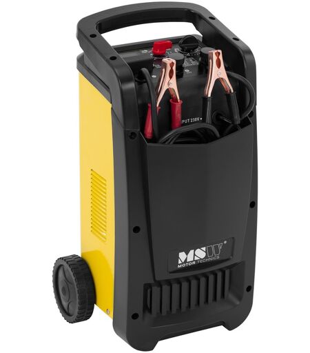 Now, why wouldn't you want one? Are you are on the road a lot, but only for short distances of less than five minutes? Particularly in winter, your battery is no longer able to cope. With the professional and compact car battery charger from MSW, you can jump-start your vehicle quickly and easily. Better still, don't let it get that far and recharge your car battery when it starts to lose power. Whether you are starting a petrol engine or pre-glowing a diesel engine, with the jump starter you can be prepared for any situation. The charger with a maximum starting current of 480 A reliably ensures that the engine restarts quickly even if the car battery is flat. Especially in a car workshop, where an engine is often only started for a short time, the battery hardly has a chance to charge properly. With this device, you can get a quick jump start that consumes a maximum of 8500 / 12000 W during the process. With the charger you can reliably charge car batteries with a nominal capacity of 60 - 1000. Ah. With 100 A, it achieves particularly fast charging times. With an output voltage of 12 V or 24 V, you can also use the unit for the necessary voltages for larger vehicles such as trucks. So it doesn't take long for the battery to be ready for use again after it's charged. Always check that your battery meets the recommended battery capacity before charging it. You can control the charging process for up to 60 minutes with the help of a timer. The three-digit LED display shows you all the set values and the respective charge status. Thanks to the built-in fuse, it's protected against short circuits should you ever connect the cables with the wrong polarity. The car charger is impressive not only with its compact design, but also with numerous useful details. Use special pockets to store the long connection cables and keep your workshop tidy. Thanks to the wheels and a matching handle, you can easily transport the battery charger from one car to the next. Or simply move the unit with the sturdy handle. ...