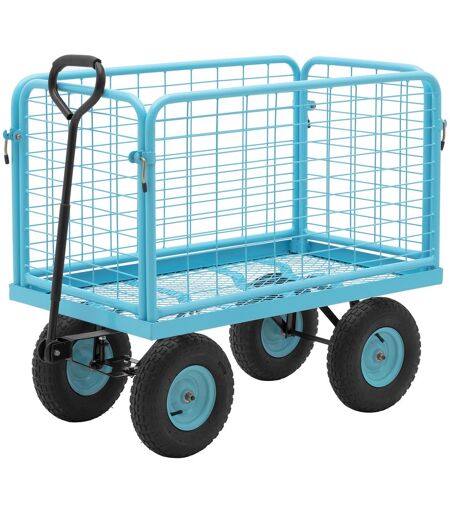 Whether as a lattice or platform trolley: the convertible garden trolley from hillvert is ready for any use. You can remove or attach the side rails in just a few steps. This way, you can move bulky or smaller goods and make loading and unloading easier. The extra-large pneumatic wheels made of rubber can easily handle uneven or muddy surfaces. In warehouses, shops, gardens or agriculture, the versatile garden cart is an aid that you will soon no longer want to be without. Thanks to its stable construction, the trolley is a winner with its large load capacity of up to 400 kg. The tilt, which can be inclined by 150 °, enables optimum maneuverability even when fully loaded; The handle, which is padded with NBR foam, is a comfortable and ergonomic guide at all times. Even as a garden trolley in adverse weather conditions, the trolley with wheels is impressive with its very long service life. In addition to the robust construction, this is ensured by the blue powder coating, which protects the steel frame from corrosion or other external influences. All other materials such as plastic and rubber are equally suitable for use in the wild as for the challenging day to day use in warehouses or workshops. ...