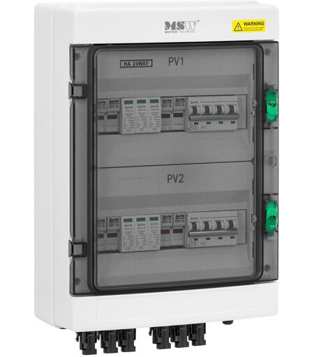 The junction box with surge protection for PV systems from MSW protects solar modules, inverters, and electrical devices from high voltages -in the event of direct or nearby lightning strikes, for example. Simultaneously optimise your solar power system and ensure efficient energy generation. To achieve this, the solar junction box features 4 separate inputs, letting you effortlessly manage and protect 4 strings. Simply install the plug-and-play junction box between the solar system and inverter. The simple wall mounting and the transparent viewing window make it easier for you to regularly check and maintain the PV junction box. Inside the ABS housing with protection class IP65, you can use two separately accessible areas (PV1 and PV2), which are clearly arranged: 8 fuse boxes suitable for current fuses (15-32A), product equipped with 32A fuses inside,3 surge protectors (DC / 1000 V / 40 kA) and2 disconnectors (1000 V / 63 A), to connect or disconnect and protect the strings of your PV system. Thanks to the clamp connections and the cable channels integrated into the sides, you can quickly and easily activate the overvoltage protection for your PV system. All elements of the junction box with PV overvoltage protection are made of high-quality materials and comply with current regulations, such as the IEC/EN 60947-3 design standard, CE, CB, and TÜV-tested (German Technical Inspection Association) fuses as well as type 2 overvoltage protection in accordance with EN 50539-11. Prioritise safety and increase the overall efficiency of your PV system with the solar junction box from MSW! ...