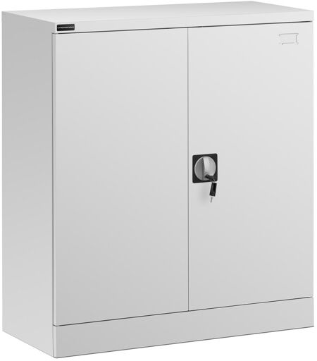 The compact metal cabinet STAR_MCAB_02 brings order to your office or workshop. You can safety store important documents or indispensable materials inside. The office cabinet is an unobtrusive grey, so it will blend in to any environment. The steel storage cabinet's solid construction and cylinder lock for the three-point espagnolette offer optimum security. The two included keys are made of a durable zinc alloy. This means that your documents, work materials or valuables can always be kept securely under lock and key. The tool cabinet is made of steel coated with nearly indestructible epoxy resin. This makes the metal office cabinet able to withstand harsher environments without showing any signs of wear. The door hinges are reinforced and can be opened and closed effortlessly. One door has a built-in label holder. Two large shelves with a thickness of 0.6 mm provide the interior with structure. The inserts have a reliable load capacity of 40 kg. The air vents provide the metal office cupboard with a pleasant inner climate. The metal cabinet is easy to assemble and install with screws using the instruction manual. At 102 cm tall and with its inserts, it offers ample storage space to enhance any workshop's equipment or office furniture. The feet are coated in plastic to protect the floor from scratches and other damage without forfeiting stability. ...