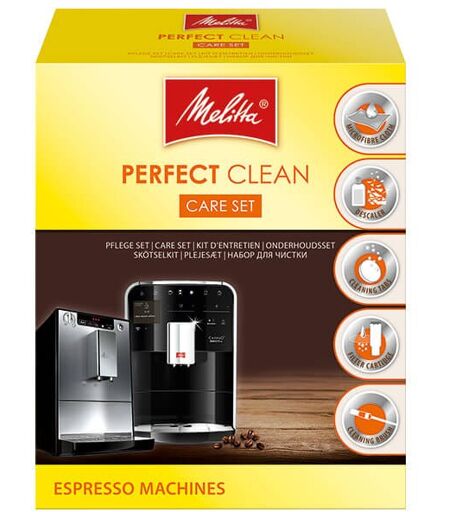 Regular cleaning and descaling of your espresso coffee machine not only prolongs its life, it also improves the taste and flavour of your coffee.Melitta's Perfect Clean Espresso Machines Care Set includes everything you need to accomplish this. Set contains, 1x Perfect Clean Microfibre Cloth 1x Anti Calc Liquid Descaler, 1x Perfect Clean Cleaning Tabs 1x Pro Aqua Filter Cartridge,1x Cleaning Brush ...