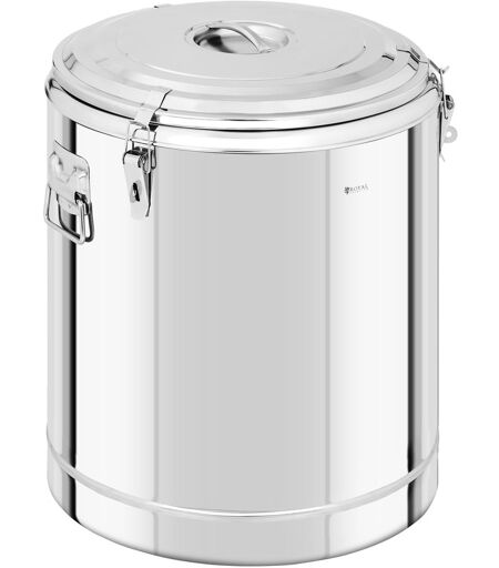 The stainless steel thermos container is designed to make transportation of hot and cold food and beverages simple and safe. Royal Catering - your online retailer for catering equipment - has specially designed the stainless steel thermos container for upscale restaurants and hotels, as well as for commercial kitchens, canteens, and catering delivery services. If you value functionality, durability and appealing design in your kitchen equipment, then this 80-litre, double-wall insulated thermos container is an indispensable helper for keeping food warm. The thermos container has a holding capacity of 80 litres. The container and lid are made of heat-resistant double-walled stainless steel and have an additional insulation layer between the two stainless steel walls. The double-walled insulation maintains the temperature of food or drinks for up to 12 hours. The food service thermos container has a removable stainless steel lid which helps to maintain the temperature of the contents. The lid has two easy-to-use snap closures which ensure a tight fit and cleanliness during transportation. In addition, the container has two ergonomic handles which also make it easy to transport. Thanks to the first-class workmanship in brushed stainless steel, the thermos container also shines from a hygienic point of view. The surface of the container is resistant to impurities such as rust, water stains, corrosion or leftover food. The contents remain food-safe in taste and smell. The high-quality workmanship makes for easy maintenance and cleaning. ...