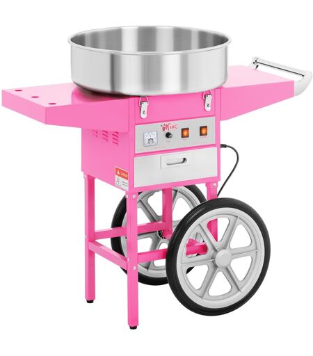 The cotton candy machine with cart combines fast production with an attractive and hygienic vending station. With this model, you can quickly prepare candy floss thanks to the highly efficient 1200 W heating element. Two independent toggle switches allow you to control the temperature and spinning head rotation separately. The 52 cm stainless steel pot is perfect for preparing large quantities of candy floss at once. The cotton candy maker from Royal Catering is thus the ideal companion for festivals, theme parks, cinemas, street fairs and much more. Positioned on two large wheels, you can easily relocate the cart as needed. The pneumatic tyres allow for smooth pushing of the stand. The steel cart boasts an eye-catching and durable powder-pink coating. Pull and push the device effortlessly with the large handle. Two rubberised feet ensure for a stable footing on uneven surfaces. A convenient drawer offers space for accessories like candy floss sticks or the included measuring spoon. The bowl and spinning head are removable. This allows you to clean the individual parts of the candy floss machine quickly and easily. Simply use water and detergent to do so. ...