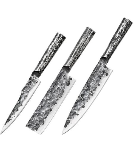 The Samura Meteora Set of 3 Kitchen Knives include a 6.9 utility knife, a 6.8 nakiri knife and a 8.2 chef's knife. Perfect for gifting in the stylish box or as a great starter set for home. Crafted from individual pieces of steel through hand forging, Meteora knives capture the rugged beauty of outer space. Their otherworldly design appeals to cooking enthusiasts seeking to make a distinctive statement. These knives are meticulously balanced and undergo convex sharpening, guaranteeing superior cutting performance across a variety of tasks and are expertly balanced and sharpened with a convex edge, delivering outstanding cutting precision across a range of ingredients. The Meteora range is perfect for adventurous cooks who desire high-performance tools that mirror their bold approach to cooking. Knives are not for sale to persons under the age of 18. - all knives and bladed products are delivered by Age Verified Delivery (AVD). The carrier may request proof of age in order to deliver your parcel. If proof of age is not available, or the recipient is underage, the carrier will refuse to deliver. ...