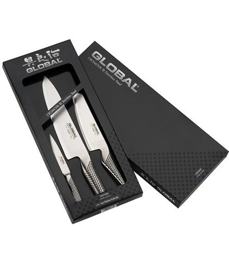 Global G-2 Cooks Knife 20cm Global GS-5 Vegetable Chopper 14cm Global GS-38 Paring Knife 9cm An ideal way to start your Global collection or even the perfect gift. Manufactured by Yoshikin in Niigata, Japan, using exclusive CROMOVA 18 high carbon stainless steel Superior razor sharp edge ground steeply to a point on an acute angle holding a sharper edge for longer Precisely balanced hollow sand filled handle Smooth contours and seamless construction, eliminates food or dirt traps offering the ultimate safety and hygiene Excellent stain resistance and edge retention Knives are not for sale to persons under the age of 18. - all knives and bladed products are delivered by Age Verified Delivery (AVD). The carrier may request proof of age in order to deliver your parcel. If proof of age is not available, or the recipient is underage, the carrier will refuse to deliver. ...