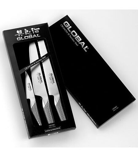 Global G-9 Bread Knife 22cm Global GS-3 Cooks Knife 13cm Global GS-7 Paring Knife Spearpoint 10cm An ideal way to start your Global collection or even the perfect gift. Manufactured by Yoshikin in Niigata, Japan, using exclusive CROMOVA 18 high carbon stainless steel Superior razor sharp edge ground steeply to a point on an acute angle holding a sharper edge for longer Precisely balanced hollow sand filled handle Smooth contours and seamless construction, eliminates food or dirt traps offering the ultimate safety and hygiene Excellent stain resistance and edge retention Knives are not for sale to persons under the age of 18. - all knives and bladed products are delivered by Age Verified Delivery (AVD). The carrier may request proof of age in order to deliver your parcel. If proof of age is not available, or the recipient is underage, the carrier will refuse to deliver. ...