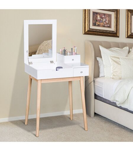 This stylish, Scandinavian-inspired dressing table has a flip-top with a concealed mirror, so it can be converted into a small writing desk if needed. It is made from manufactured wood and stands on four legs that have wood grain detailing. The tabletop is deep enough that it can store toiletries and accessories, and it includes two small drawers for storing other essentials. Assembly is required. Hashtag Home ...