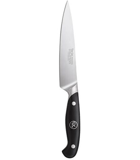 The Robert Welch Professional V 14cm Kitchen Knife features a fully forged German DIN 1.4116 stainless steel blade with a full tang. The German steel is hardened to Rockwell 57 making it ideal for everyday use for both the keen cook or professional chef. The ergonomic handle provides a firm and comfortable grip and is made from tactile DuPont™ POM complete with the Robert Welch insignia. Each of the professional V knives are designed with a larger handle and are heavier in the hand than the signature collection. The chefs knife uses the 15° edge for superior sharpness making it ideal for preparing meat, cheese and vegetables of all varieties and perfect for crushing garlic and herbs. The Robert Welch Professional V 14cm Kitchen Knife comes complete with a Robert Welch lifetime guarantee. The knife is dishwasher safe for easy and convenient cleaning, however we recommend hand washing to prolong the life of the knife and use a good quality sharpener to maintain the blade. Blade length:14cm, Knife length: 25cm. Knives are not for sale to persons under the age of 18. - all knives and bladed products are delivered by Age Verified Delivery (AVD). The carrier may request proof of age in order to deliver your parcel. If proof of age is not available, or the recipient is underage, the carrier will refuse to deliver. ...